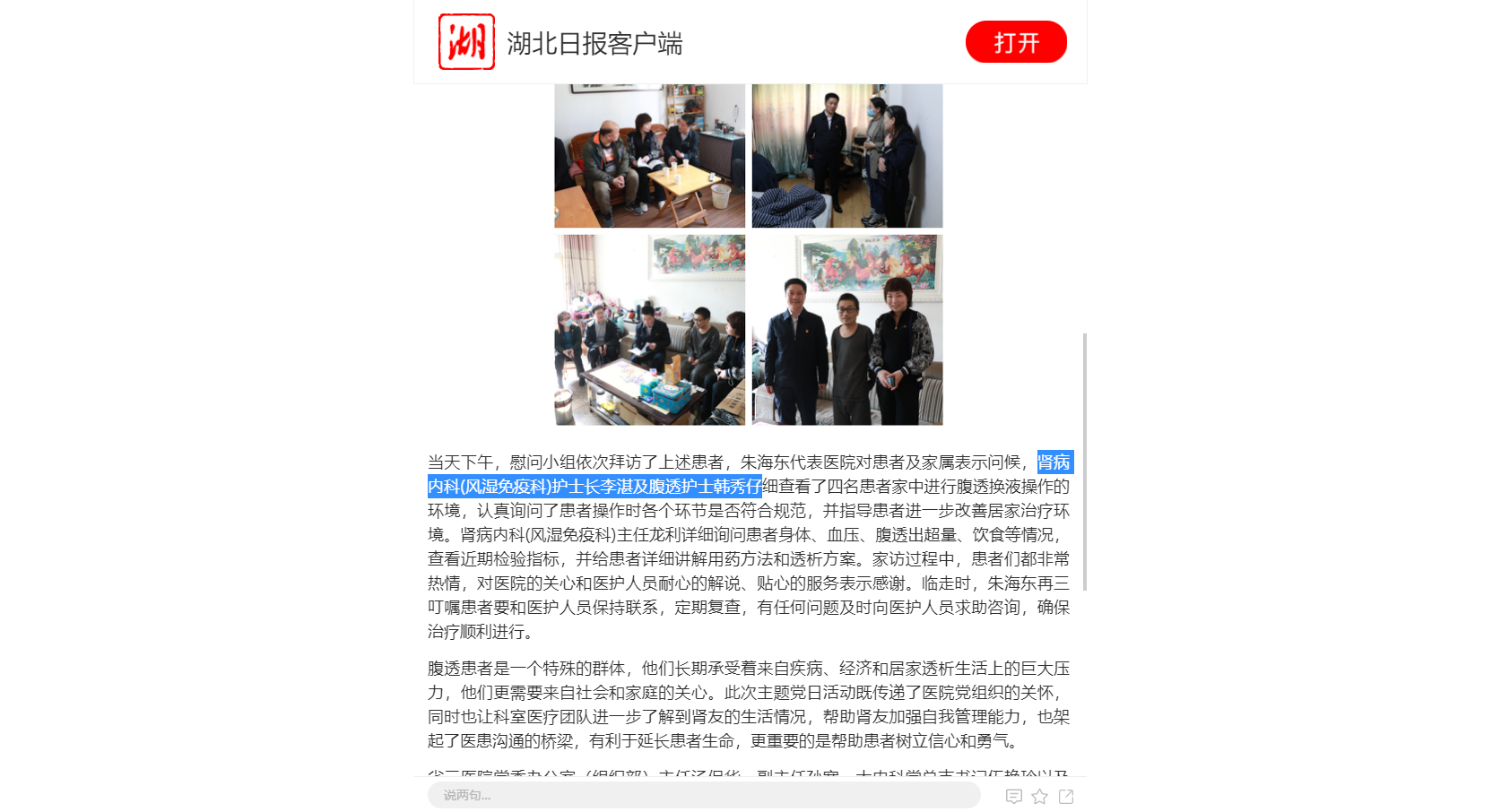 【湖北日报】省三医院肾病内科党支部开展爱心访视暨主题党日活动 发布时间:2023-05-04 来源:湖北日报 上一篇:【长江云】经山历海,不远万里,新疆患者为医护点赞:“我的选择没有错。” 下一篇:【长江云】小伙急性肺栓塞命悬一线 多学科联合救治顺利脱险
