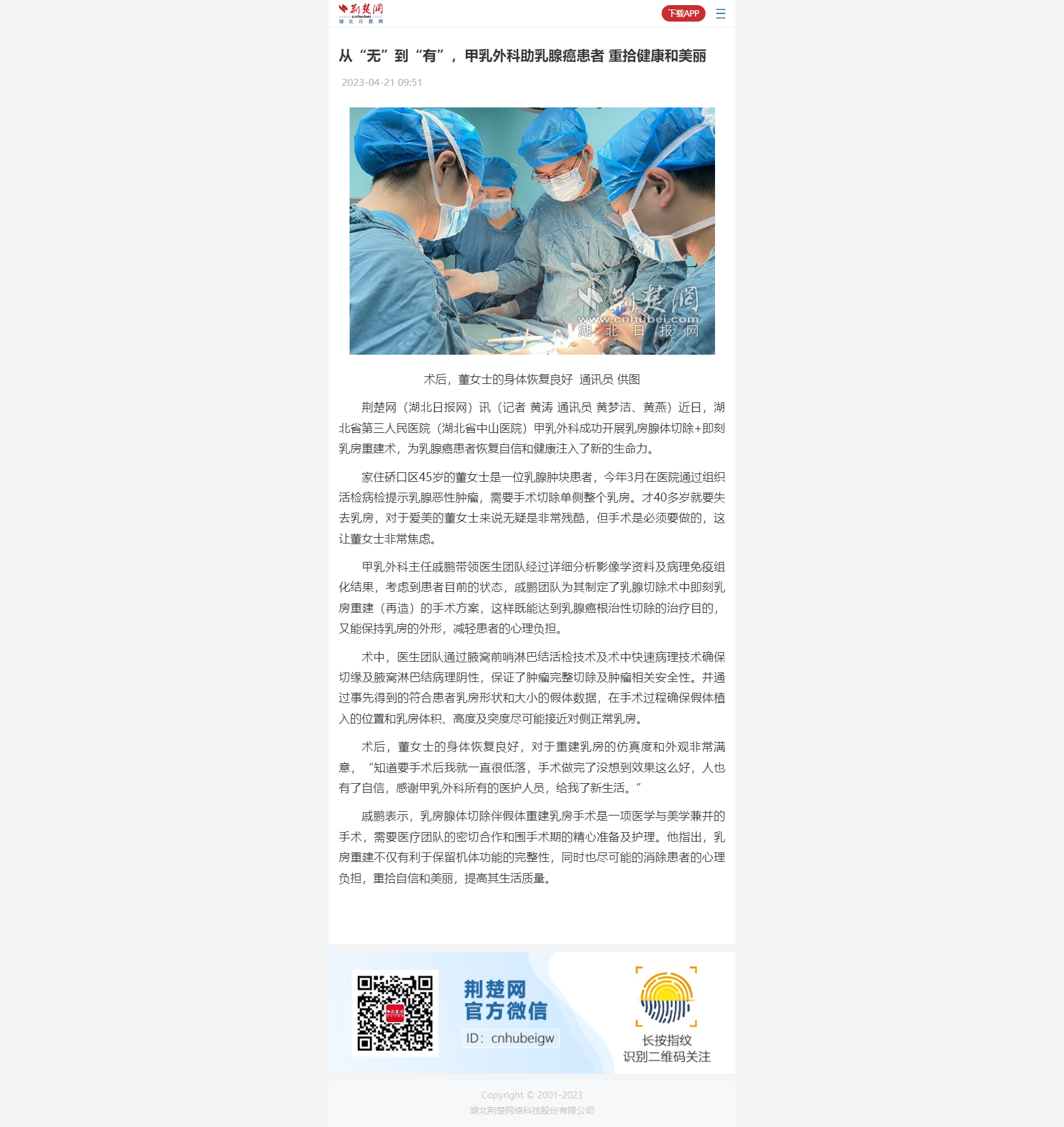 【荆楚网】从“无”到“有”,甲乳外科助乳腺癌患者 重拾健康和美丽 发布时间:2023-05-04 来源:荆楚网 上一篇:【长江云】重燃新“膝”望 湖北省第三人民医院为6旬婆婆成功进行膝关节翻修术 下一篇:【长江云】省级医院首例,骶神经调控术帮助患者解决“方便”难题