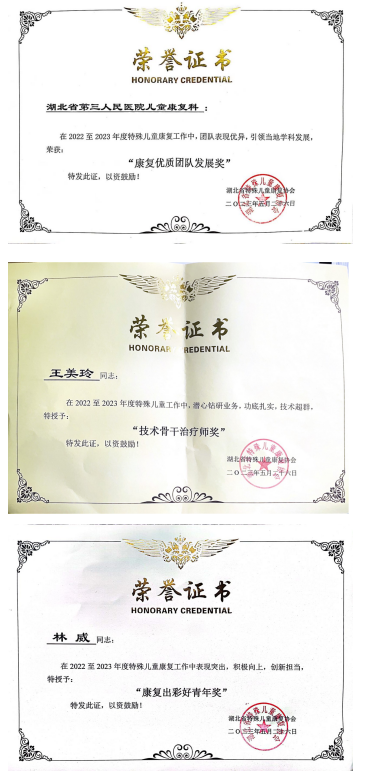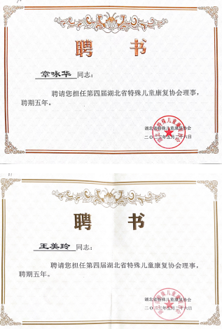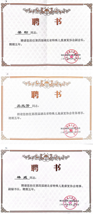 因在儿童康复领域取得的成绩及在省内为促进各地基层单位学科水平做出的贡献,我院儿童康复科梁松教授被聘为湖北省特殊儿童康复协会副会长,科主任吴兆芳被聘为常务理事,医生林威被聘为协会副秘书长,技师长章咏华及治疗组长王美玲被聘为协会理事。