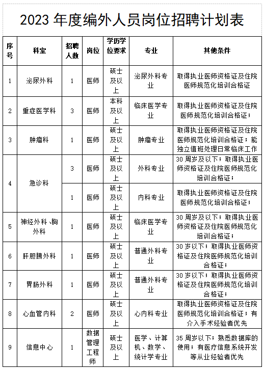 根据医院建设规模和业务发展需要,为加快医院学科建设,满足业务发展需要,培养一支高素质专业团队,现面向社会公开招聘卫生专业技术人才,具体岗位及要求如下: