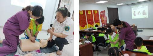 在课堂上,肖芳及团队讲解了暑期常见的意外中暑、溺水、气管异物的急救、预防的方法,并教授大家如何正确的拨打120、如何进行心肺复苏操作以及使用海姆立克法自救和互救等知识。