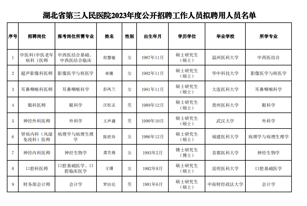 附件:湖北省第三人民医院2023年度公开招聘工作人员拟聘用人员名单