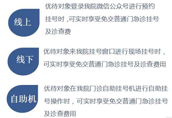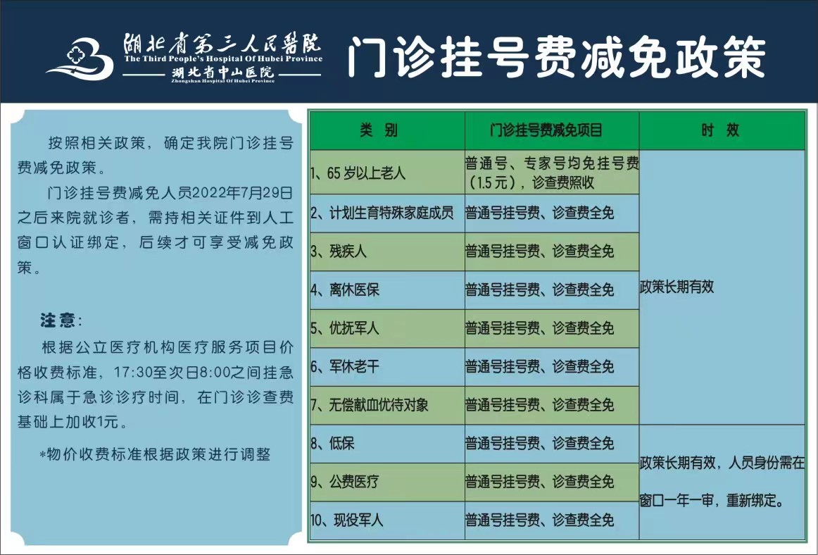 按照相关政策,为体现对特殊群体的人文关怀,我院对65周岁以上老年人、计划生育特殊家庭成员、残疾人、离休医保、优抚军人、现役军人、军休老干、低保、公费医疗人员给与普通门急诊挂号费减免,具体见下图。首次来我院就诊需到人工窗口认证绑定。