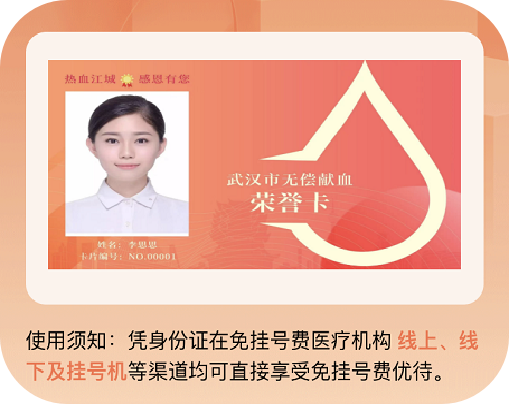 在未建档的情况下,为保证符合资格群体的权益能正常进行,需出示个人无偿献血电子荣誉卡及身份证两种证件,人工窗口补充建档后即可享受免交普通门急诊挂号及诊查费。一次建档,长期有效。电子荣誉卡如图所示: