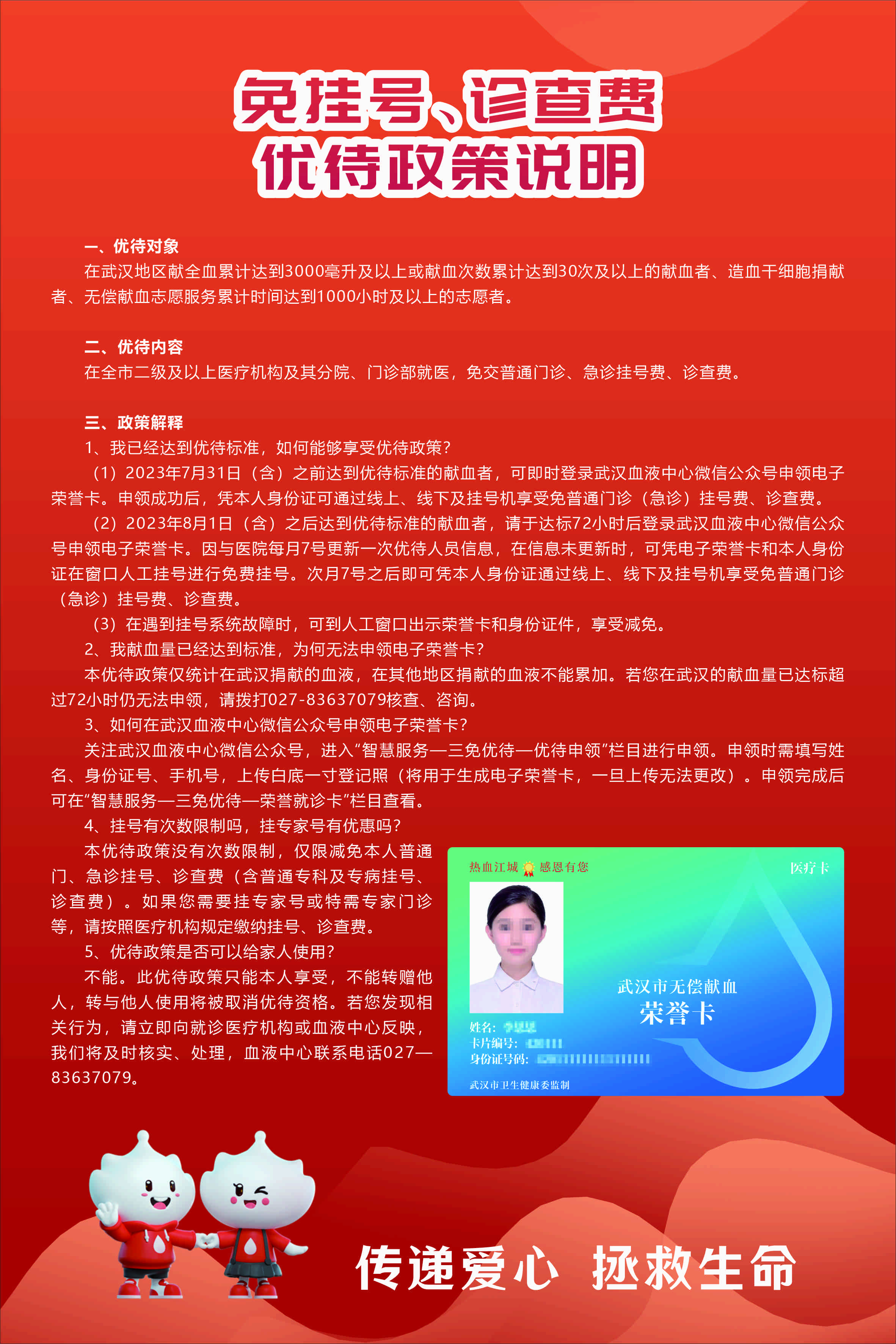 免挂号、诊查费优待政策说明 发布时间:2023-07-28 来源:医务部门诊办公室 上一篇:致敬献血者,点亮生命红 | 无偿献血优待对象来我院就诊免普通门急诊挂号费和诊查费 下一篇:加强乡村医生培训,助力基层医疗水平提升——2023年新洲区乡村医生岗位培训在省三医阳逻院区举办