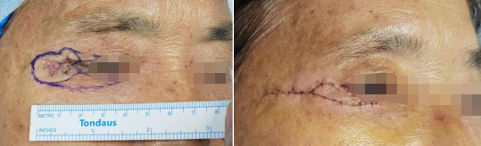 71岁的李婆婆8年前右侧眼角处长了一个老年斑,由于不痛不痒没啥症状,几年来李婆婆也不以为意,可最近一年,斑块却反复溃烂,来到湖北省第三人民医院(省中山医院)医疗美容科做检查,结果吓了一跳,李婆婆的老年斑竟是皮肤基底细胞癌。