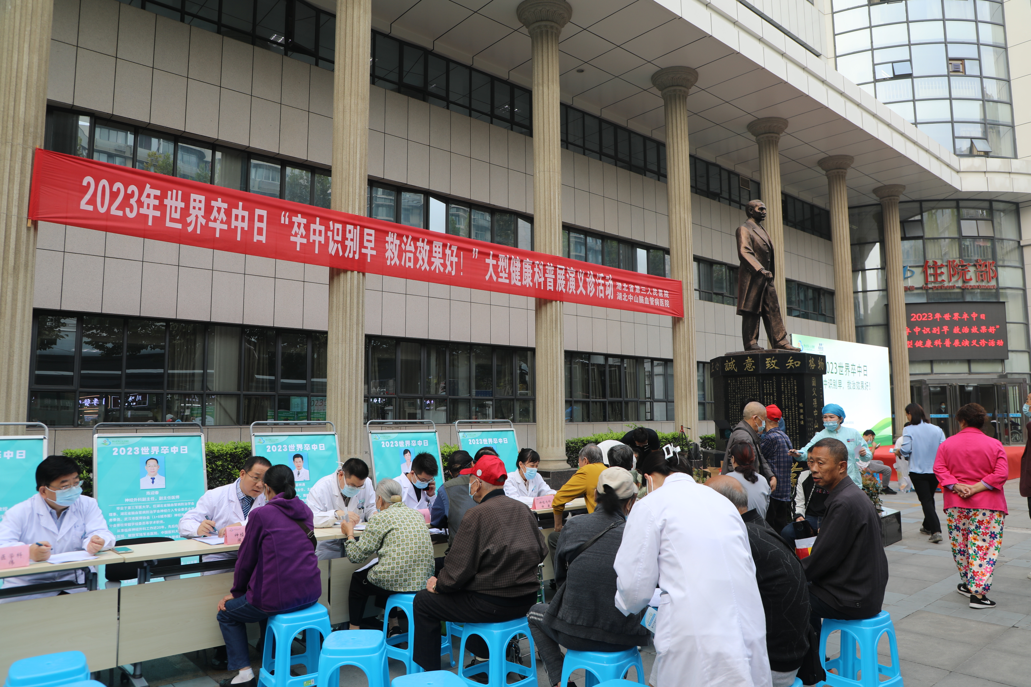 2023年10月29日是第18个“世界卒中日”,为积极响应脑血管病救治关口前移、早防早治的方针政策,有效普及脑卒中防治知识,提高群众自我防护意识,湖北省第三人民医院(湖北省中山医院)在铜像广场举办大型科普展演义诊活动。神经内科、神经外科、心血管内科、内分泌科、康复医学科、中医科(老年病科)、临床营养科的多位专家教授参与义诊,为广大居民朋友答疑解惑。