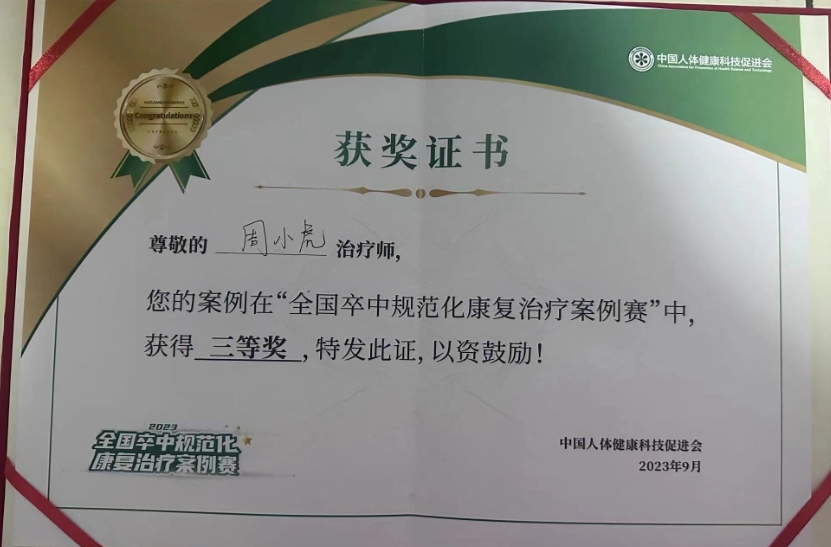 2023年10月22日,在中国人体健康科技促进会主办的第一季“2023全国卒中规范化康复治疗案例赛”中,湖北省第三人民医院(湖北省中山医院)康复中心的康复治疗师周小虎荣获第三名。