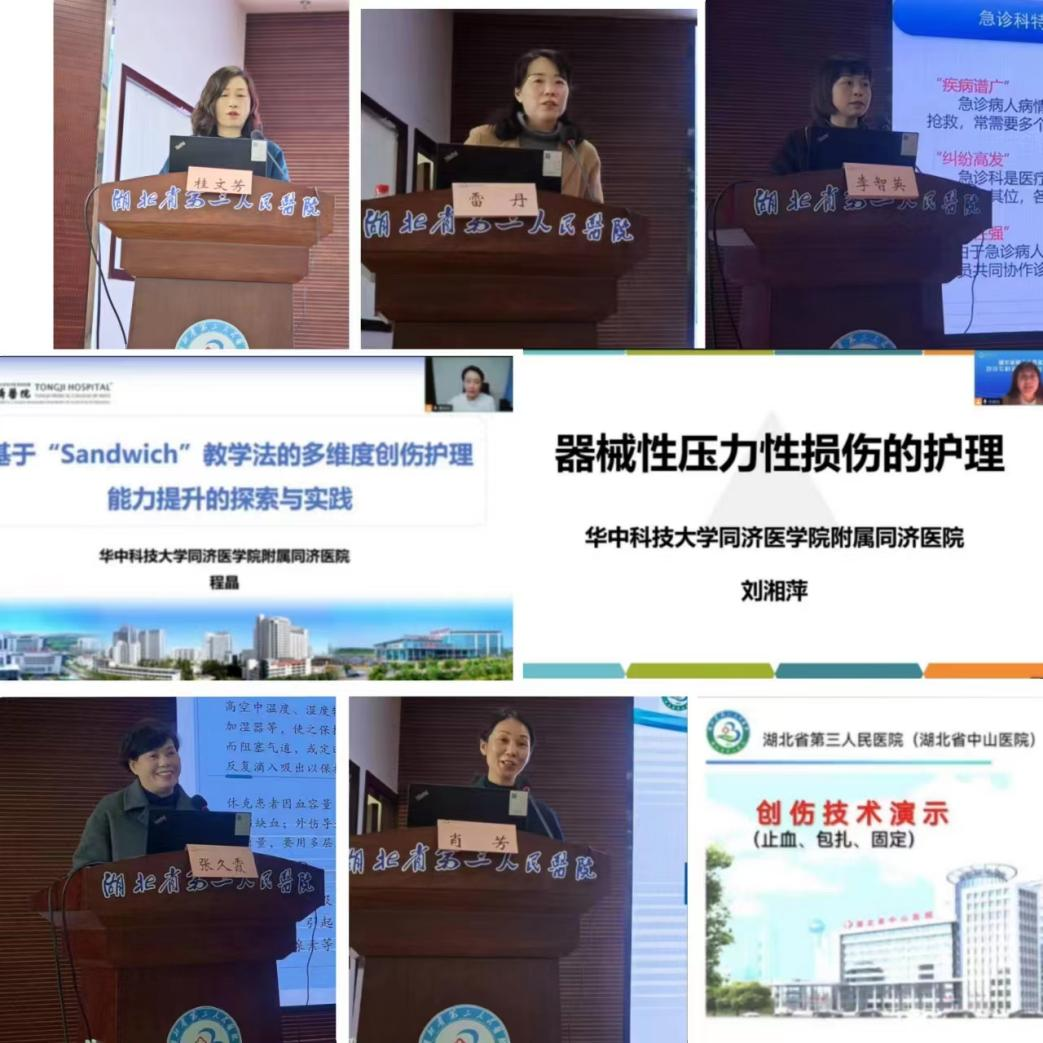 华中科技大学医学院附属同济医院门诊总护士长程晶、急诊外科护士长刘湘萍,湖北省第三人民医院护理部副主任桂文芳、大外科科护士长雷丹、大综合科科护士长李智英、久霞服务中心护士长张久霞、急救转运中心护士长肖芳、急诊科护士长胡蝶围绕多维度创伤护理、器械性压力性损伤的护理、创伤技术演示等主题进行授课。
