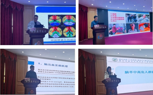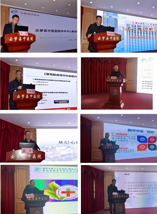 云梦县中医医院业务院长安斌、湖北省第三人民医院神经外科林爱龙教授、孝感市中心医院神经内科李庭毅教授、湖北省第三人民医院神经外科别毕洲教授、湖北省脑卒中防治中心办公室副主任孟强、天门第一人民医院神经内科黄骥教授、湖北省第三人院神经外科陈迎春教授、湖北省第三人民医院神经内科彭涛教授、湖北省第三人民医院放射科高翔、云梦县中医院脑病科邓子如教授、湖北省第三人民医院康复科主任彭全成、湖北省第三人民医院神经外科柳洁教授围绕《云梦县中医医院卒中中心建设汇报》《神经外科学科建设与未来展望》《急性缺血性脑卒中的血管内治疗》《颈动脉狭窄的诊断与治疗》《基层卒中防治站建设政策解读》《卒中中心的建设与发展体会》《常见出血性脑血管疾病的诊断与治疗》《基层缺血性卒中的诊疗指南》《脑血管疾病的影像诊断》《基层医院脑卒中介入诊疗体会》《脑卒中的康复治疗》《脑卒中高危人群的日常健康管理》等主题进行授课。