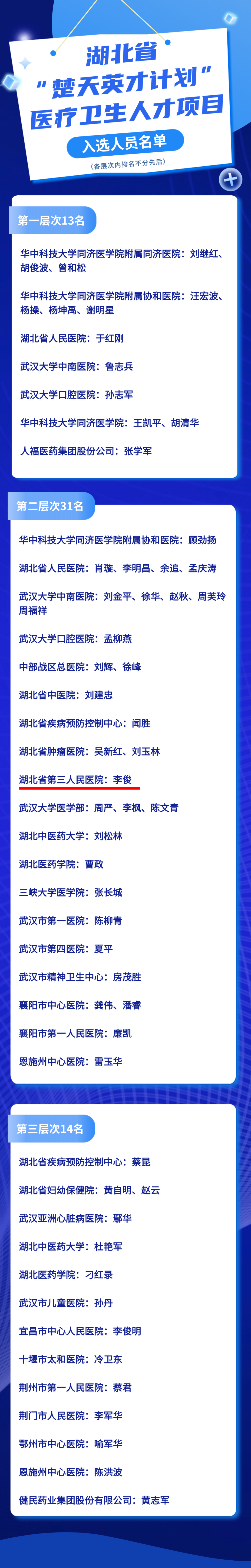 2024年1月24日,中共湖北省委组织部和湖北省卫生健康委员会联合发布了《关于公布湖北省“楚天英才计划”医疗卫生人才项目入选人员名单的通知》(鄂卫发〔2024〕1号),湖北省第三人民医院(湖北省中山医院)神经外科主任李俊入选湖北省“楚天英才计划”医疗卫生人才项目。
