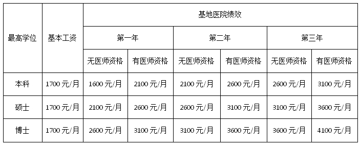 培训身份为本单位住院医师,基本工资按照医院人事相关规定保持不变,绩效分为3200元/月(无医师资格)和3700元/月(有医师资格)两档。