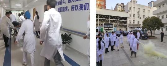 疏散演练环节,教官使用无毒烟饼模拟示教室起火,瞬间浓烟滚滚,值班护士发现火情后马上按下最近的手动报警按钮,并拨打后勤保卫部电话,当班医生熟练地按照灭火流程和方法扑灭火情,同时将危重病人转移到安全的地方。