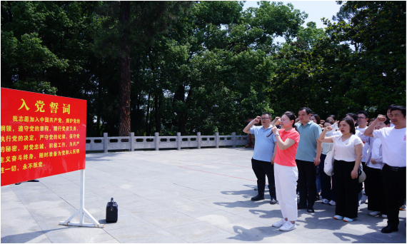 在党办主任方洁的带领下,全体党员庄严地举起右手,重温入党誓词。