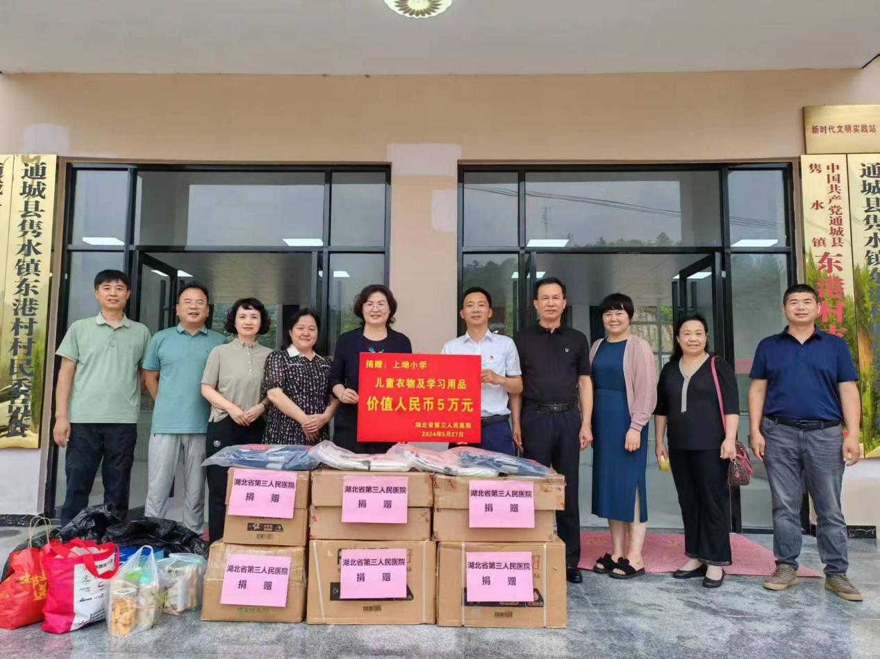 在“六一”国际儿童节来临之际,5月27日,湖北省第三人民医院(湖北省中山医院)纪委书记兼工会主席邓小容及爱心妈妈一行来到通城县隽水镇东港村,开展“心系儿童成长、助力乡村振兴”暨2024年六一儿童节前夕慰问儿童活动,并向上坳小学捐赠价值五万元的儿童衣服和学习用品。省卫生健康委驻村工作队队长、东港村第一书记陈军、上坳小学校长吴剑出席捐赠仪式。