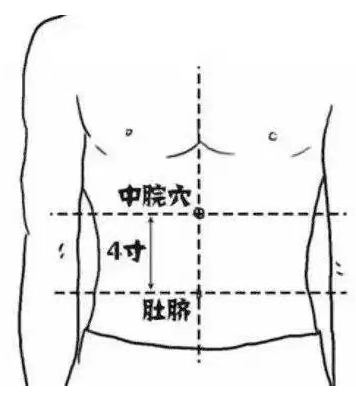 中脘穴在身体正中,肚脐向上4寸处,专治胃寒、胃痛、呕吐、泄泻。用食指和中指并在一起点按1分钟,中脘穴处会有热热的感觉。经常点按,可以治胃痛,缓解紧张、焦虑。