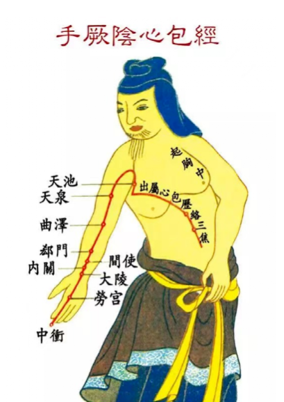 心包经位于双侧上臂内侧中线,由上向下按压,感觉疼痛的地方重点按压,每日2-3次,每次2~3分钟。