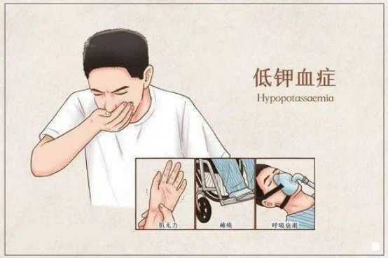 低钾血症(hypopotassaemia)是指血清钾浓度低于3.5mmol/L。钾是人体不可缺少的元素,其作用主要是维持神经、肌肉的正常功能。因此,人体一旦缺钾,不仅精力和体力下降,而且耐热能力也会降低,最突出的表现就是四肢酸软无力,出现程度不同的神经肌肉系统的松弛软瘫,尤以下肢最为明显,称为缺钾软瘫。严重时还会导致人体内酸碱平衡失调、代谢紊乱、心律失常,且伴有心血管系统功能障碍,如胸闷、心悸,甚至可出现呼吸肌麻痹、呼吸困难。缺钾还可以加重洋地黄中毒导致死亡;总之,出现低血钾,需要及时纠正,避免引起严重的并发症发生。