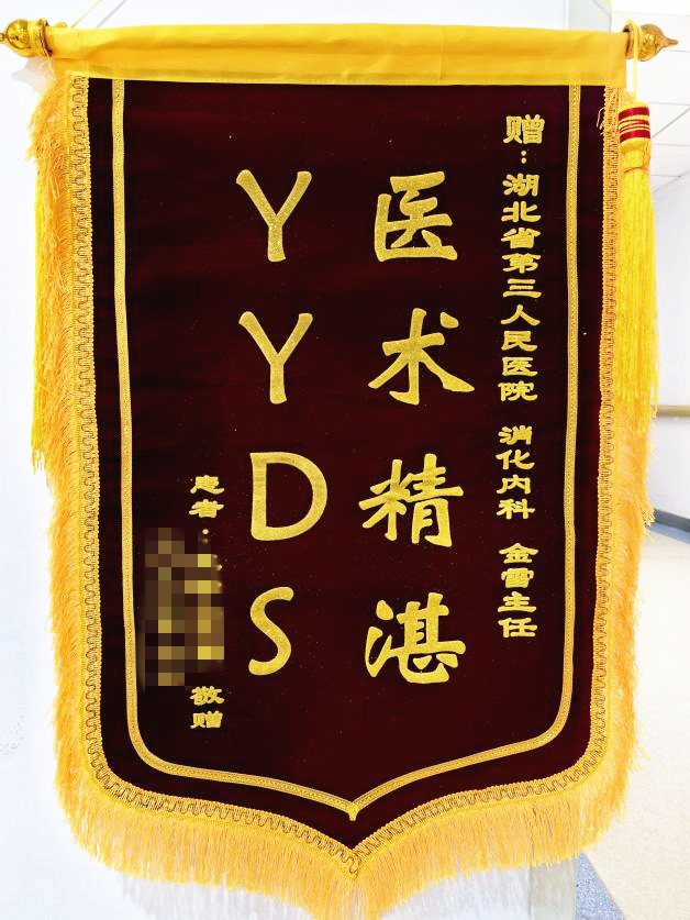 “医术精湛,YYDS!”近日,患者王先生和家属向湖北省第三人民医院(湖北省中山医院)消化内科主任金雷送上了一面既真挚又有趣的锦旗,为的是感谢金主任帮他解决疾病困扰,恢复健康生活。