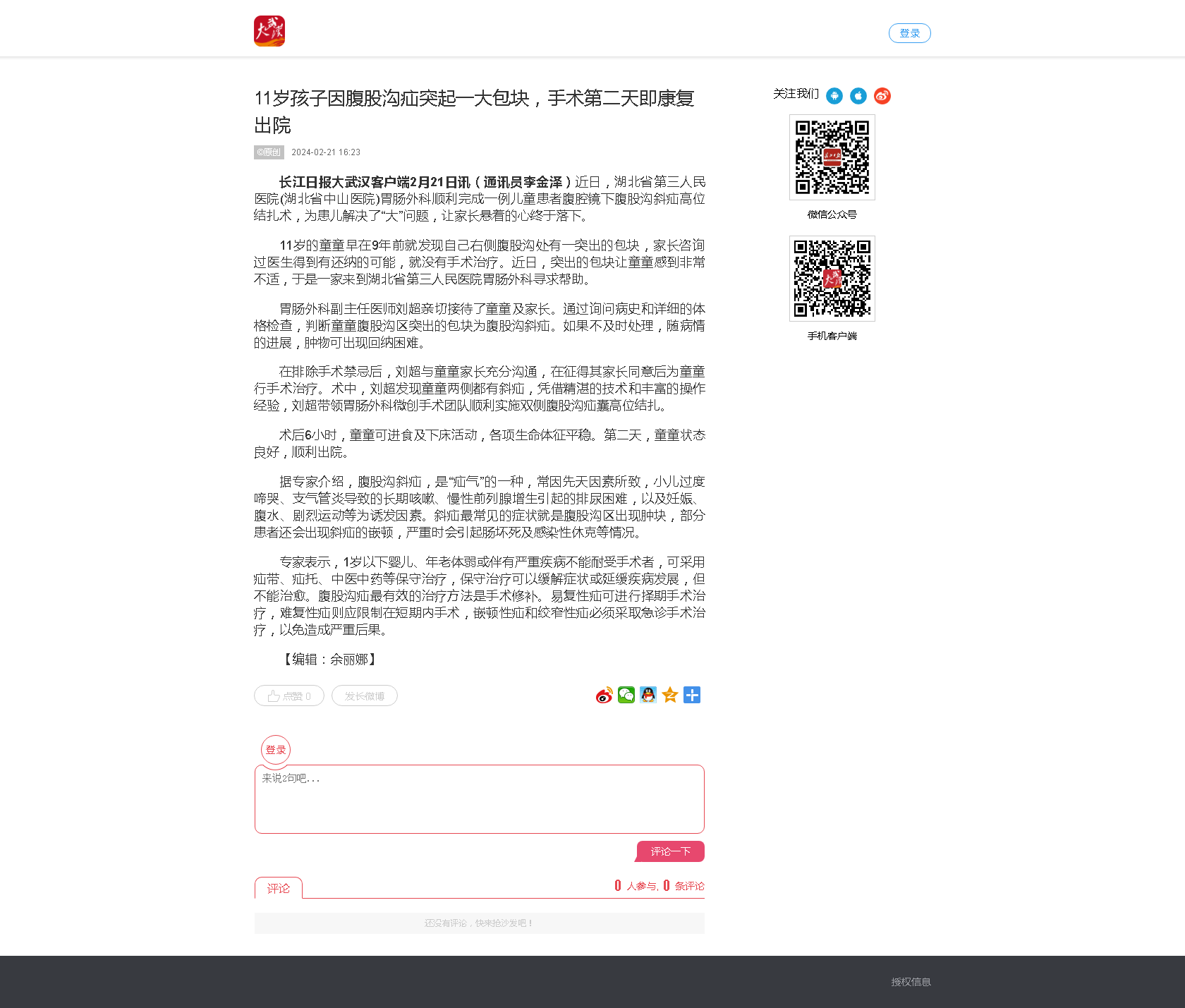 11岁孩子因腹股沟疝突起一大包块,手术第二天即康复出院 发布时间:2024-07-12 来源:长江日报 上一篇:3岁“呼噜”娃张口呼吸,“小手术”解除“大隐患” 下一篇:冰雪寒风步履不停,武汉这家医院守护“医”路平安