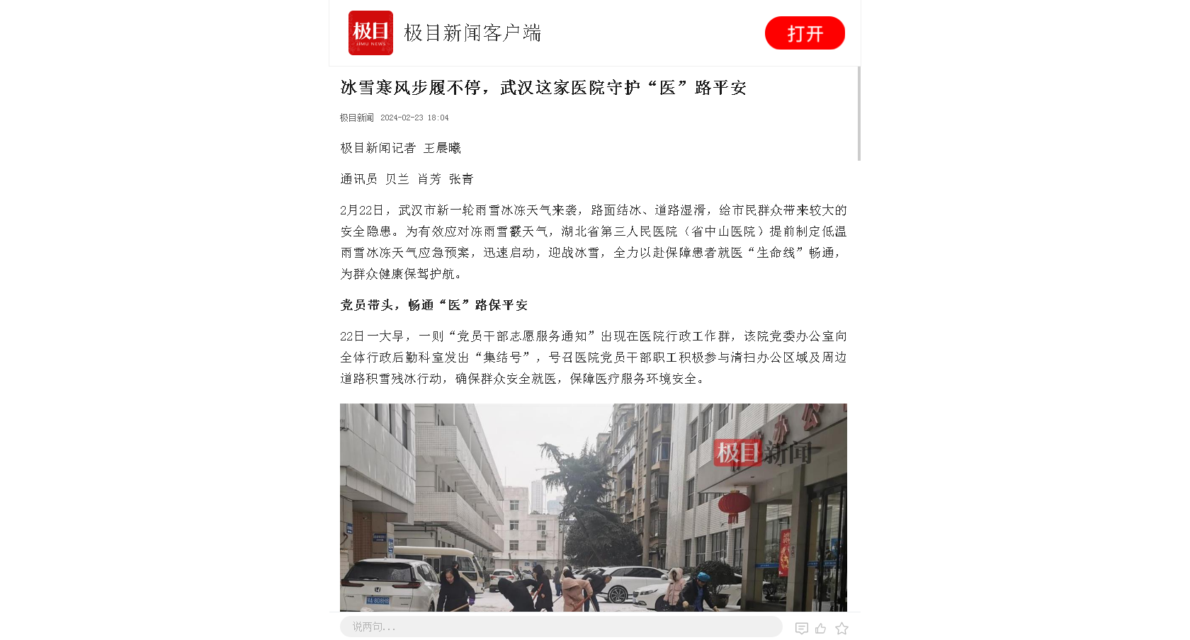 冰雪寒风步履不停,武汉这家医院守护“医”路平安 发布时间:2024-07-12 来源:极目新闻 上一篇:11岁孩子因腹股沟疝突起一大包块,手术第二天即康复出院 下一篇:独居老人没有如约治疗,细心医护辗转联系其家人发现老人摔倒在卫生间