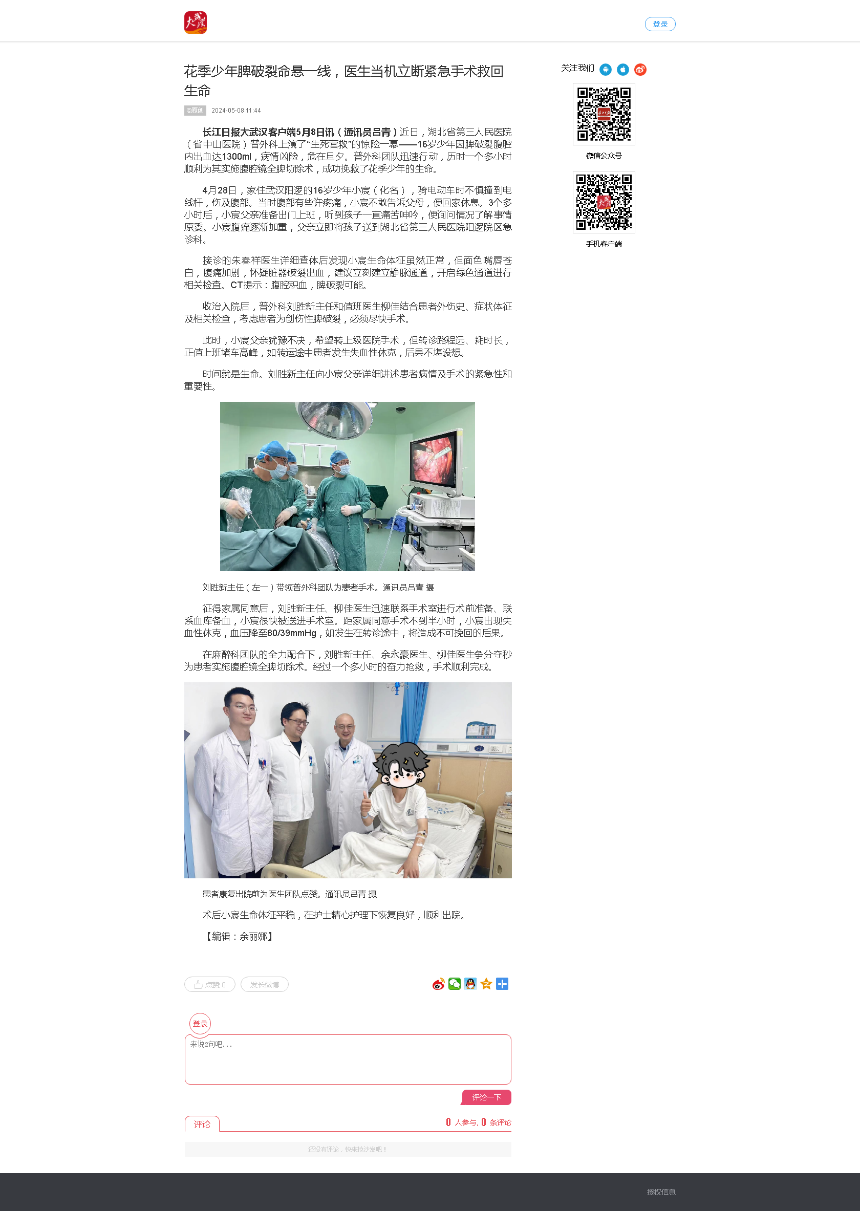 花季少年脾破裂命悬一线,医生当机立断紧急手术救回生命 发布时间:2024-07-12 来源:长江日报 上一篇:多器官衰竭,命悬一线!小小结石引发重症胰腺炎 下一篇:紧急联动,生命接力,湖北省第三人民医院神经内科成功救治通山县82岁脑卒中危重患者