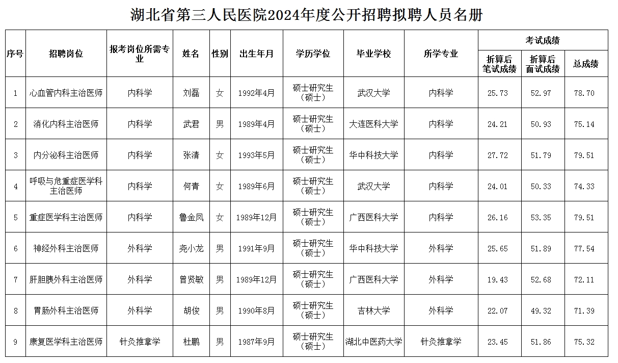 湖北省第三人民医院2024年公开招聘拟录用人员公示