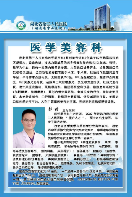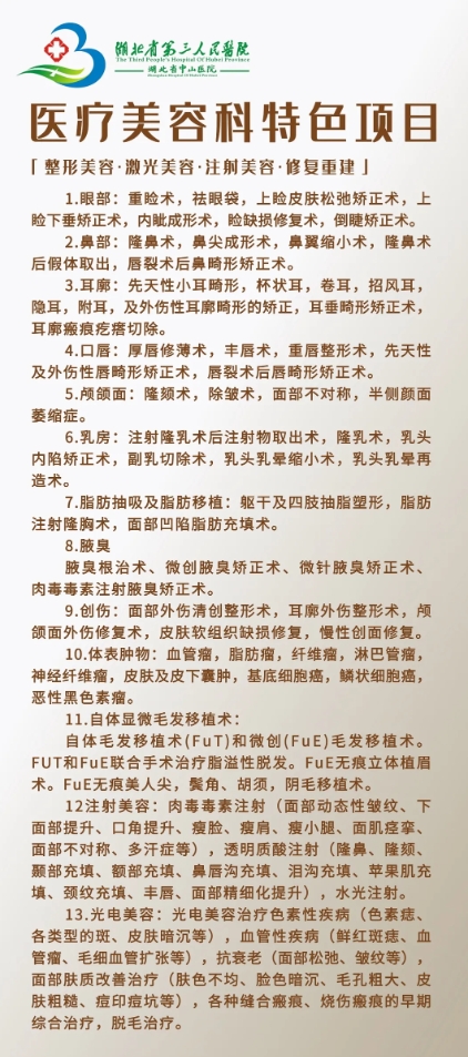 医疗美容科门诊:硚口区中山大道26号,湖北省第三人民医院老门诊二楼医疗美容科201室。