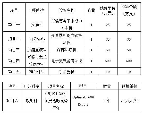 根据我院医疗设备采购、维保需求,拟采购以下医疗设备及维保项目,现将相关要求公布如下,欢迎有意向、符合条件的生产企业及供货商积极报名。