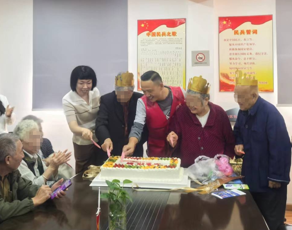 社区书记彭浩和龙主任一起切蛋糕,为老年居民庆祝重阳佳节