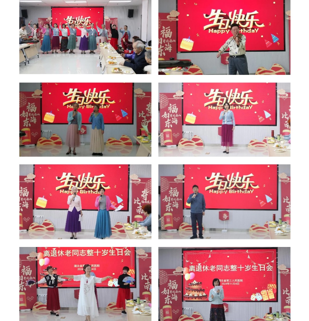 2024年11月4日上午,湖北省第三人民医院(省中山医院)在仁和楼七楼会议室举办离退休老同志整十岁生日会。生日会由工会主席邓小容主持。医院党委书记朱海东、纪委书记陈明出席生日会,部分职能部门的负责人参加活动。