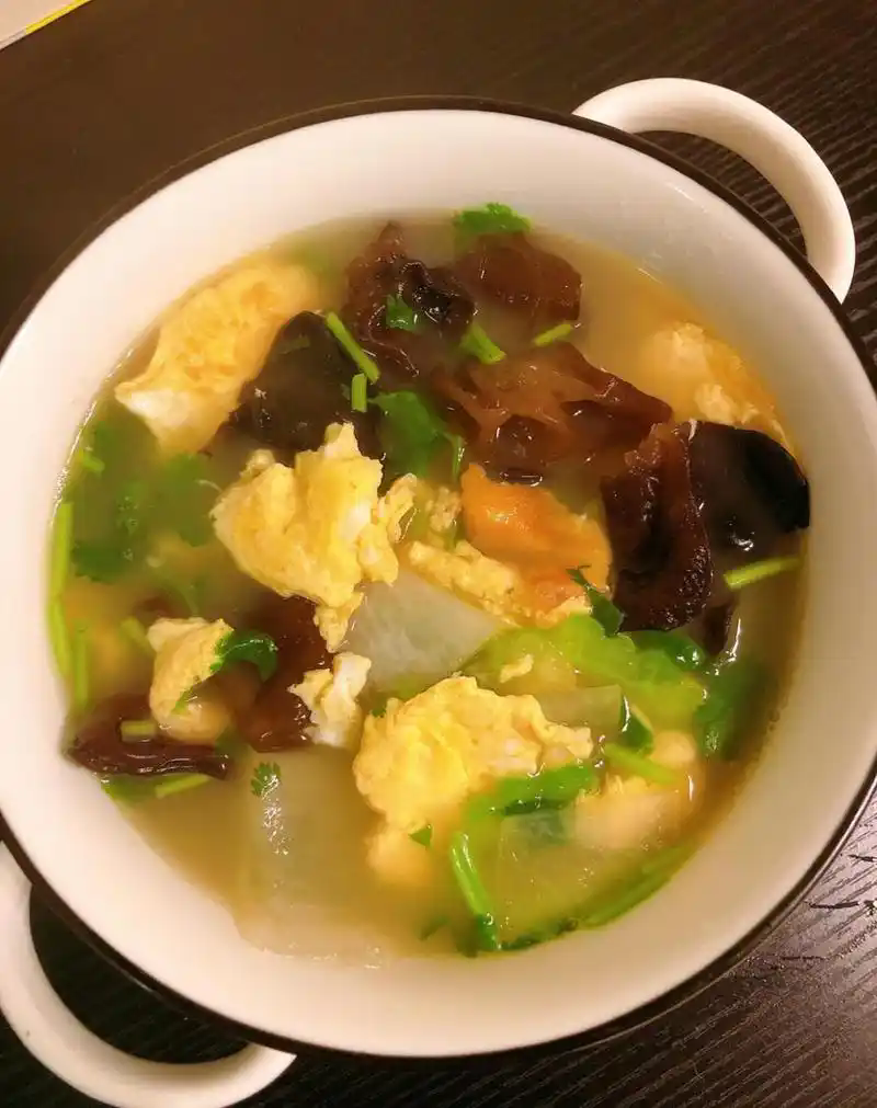 【材料】冬瓜150克,水发木耳150克,鸡蛋2个,菠菜适量,鲜汤、食盐、水淀粉、味精、麻油各适量。