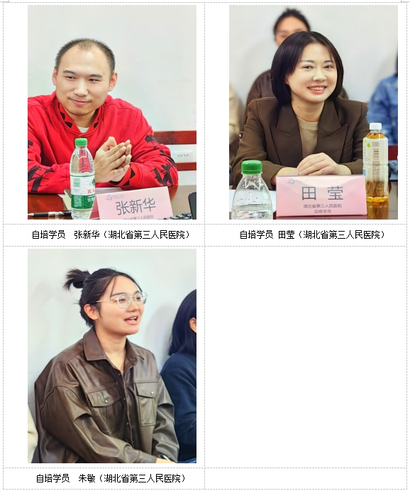 来自武汉市中心医院的李璐、武汉市第九医院的彭青和湖北省第三人民医院的张新华、田莹、朱敏作为本届学员代表分别进行发言。大家纷纷表示,在接下来的3个月内将以高度的热情投入到学习中,注重理论与实际结合,积累临床经验,力求在短时间内显著提升自身的专业服务技能和综合素养。