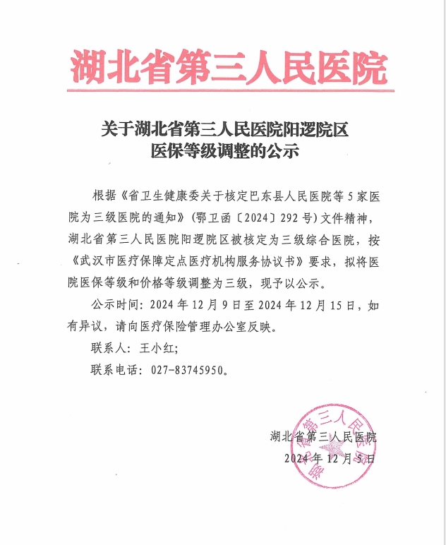 关于湖北省第三人民医院阳逻院区医保等级调整的公示 发布时间:2024-12-09 来源:医保办 上一篇:湖北省第三人民医院询价及项目论证公告 下一篇: 湖北省第三人民医院超市、咖啡吧商业配套服务项目招商公告
