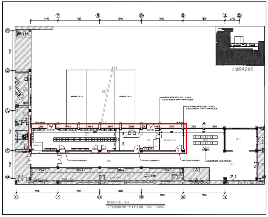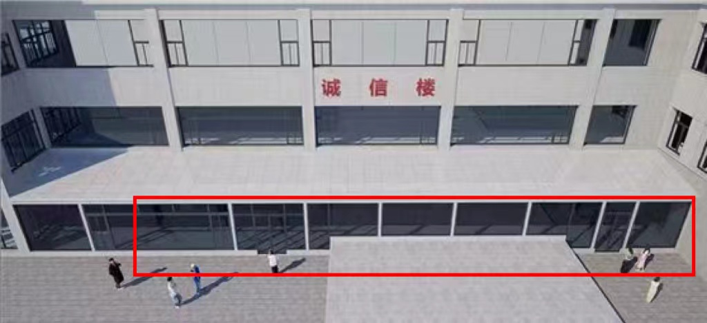 (二)项目区域:项目区域位于诚信楼正北侧(现诚信楼东、西贯穿连廊外侧)天井处,项目占地面积约147平方米,长度35.9米,宽4.1米,净高4.2米。