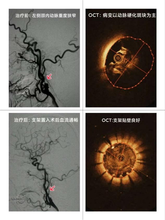 53岁的张师傅因突发脑梗由外院转入湖北省第三人民医院。经检查发现,患者为左侧颈内动脉起始部重度狭窄伴有长节段的溃疡斑块,该病变导致左侧额叶的脑梗死,经过CTA检查怀疑有壁间血肿。由于患者5年前有鼻咽癌放疗病史,那么狭窄病变的性质到底是什么呢?是动脉硬化斑块?放射性血管壁损伤?还是动脉夹层病变?不同的病变适合不同的治疗方式,CTA及磁共振检查均未给出满意答案,术前讨论建议行OCT检测进一步明确斑块性质。在万跃的带领下,医生为患者行术前造影,采用高分辨率光学相干断层成像(OCT)技术进行精准探测,明确了患者的病变性质是不均匀脂质动脉硬化斑块。