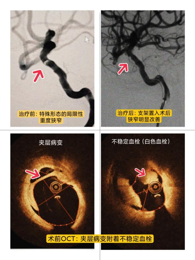 针对这种特殊形态的病变,如果能进一步明确病变性质,对介入支架的选用具有重要的指导意义。目前国内报道OCT多数还是应用在颅外段,但万跃经过造影测量病变远端血管长度、光学成像导管头端长度及评估近远端血管迂曲程度后,充分确认了进行颅内段检测的可行性,并顺利对患者的病变进行了OCT检测。检测发现,患者的病变为动脉夹层基础上形成的不稳定血栓,该血栓仍在血管内漂移,随时有脱落导致再发脑梗死的风险。