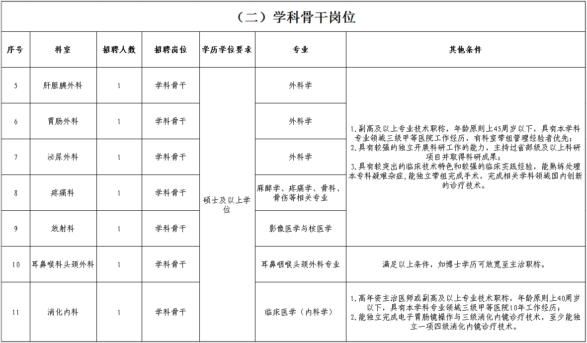 根据医院建设规模和业务发展需要,为加快医院学科建设,培养一支高素质专业团队,现面向全国招贤纳才,常年公开招聘部分学科带头人及学科骨干,诚邀各专业贤能之士加入我院,施展才干、成就梦想,携手开创医院高质量发展的美好未来。