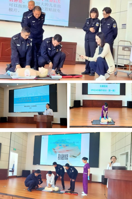 为普及心肺复苏知识与AED操作技能,提高人民警察应对突发意外情况的医疗急救能力。2024年10月31日,由湖北省第三人民医院(湖北省中山医院)托管的安康医院的医务人员对武汉市公安局安康医院三大队全体警察开展了心肺复苏及AED的理论知识及操作培训。