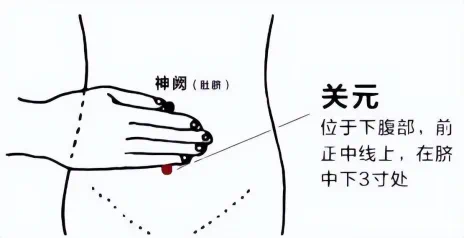 关元穴定位:位于下腹部的前正中线上方,脐中下3寸的位置。
