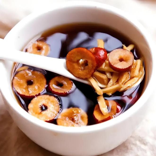 【做法】将姜洗净后切片,大枣去核。茶壶中加500ml水,放入大枣和姜片,慢火熬煮5-10分钟。加入适量红糖,搅拌均匀即可饮用。