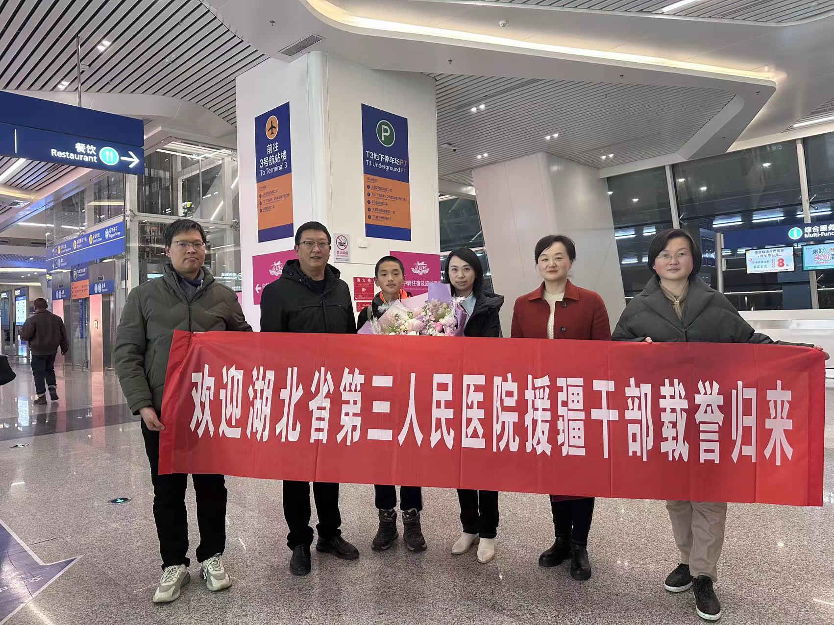 2025年1月12日晚,湖北省第三人民医院(湖北省中山医院)援疆医生李晨圆满完成任务,载誉归来,医院副院长刘黎明带队接机。