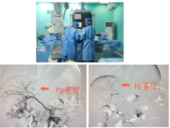 中西医结合肝病科立即启动全院多学科会诊,经各专家综合评估后一致认为放射科主任毕俊英提出的DTACE方案实用可行。肝动脉载药微球化疗栓塞术(DTACE)是一种新型的肝癌介入治疗方法,需穿刺置入一根直径2mm左右的细管直接到肿瘤内部,经管缓慢注入吸附有化疗药的载药微球,一方面用化疗药有效杀灭肿瘤细胞;另一方面通过微球可以密实栓塞肝癌的营养动脉,使其发生缺血坏死,同时将破裂出血的肿瘤血管堵上。