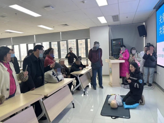 急救转运中心副主任肖芳现场为居民开展急救培训,内容包括识别心脏骤停、规范进行心肺复苏等急救知识。活动现场氛围热烈,居民朋友纷纷踊跃上台,积极互动,在肖芳志愿服务队的指导下进行实操,加深了对急救知识的认识。
