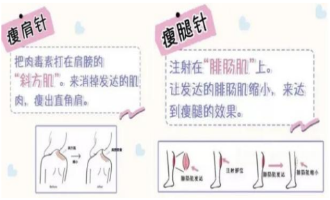 通过注射A型肉毒毒素阻滞运动神经末梢乙酰胆碱的释放,让收缩的肌肉得到放松,暂时被麻痹。肌肉从休息中会逐渐萎缩(用进废退),达到视觉上缩小肩膀、小腿体积,雕塑肩部和小腿线条的效果。