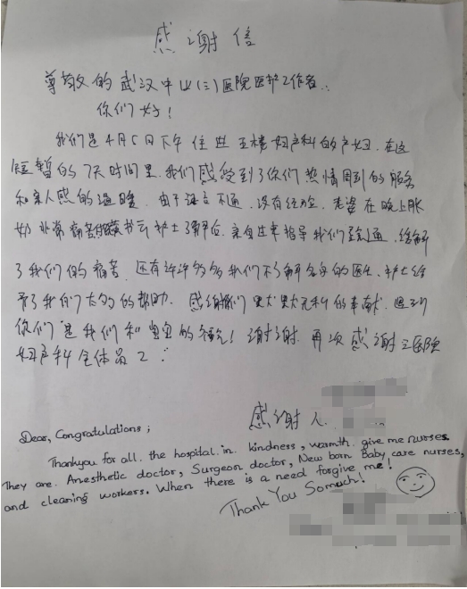 “住院的这几天非常感谢医护人员的照顾。我们是第一次当爸妈,没有经验,宝妈在涨奶时非常痛苦,在护士帮忙挤奶和疏通后,解除了奶涨的困扰。妇产科整个团队都非常优秀,医术精湛,服务态度也特别好,非常感谢大家!”今天,新手爸妈袁先生和自己缅甸籍的爱人在出院之际给湖北省第三人民医院(湖北省中山医院)妇产科医护团队送上手写感谢信来表达自己的感激之情。