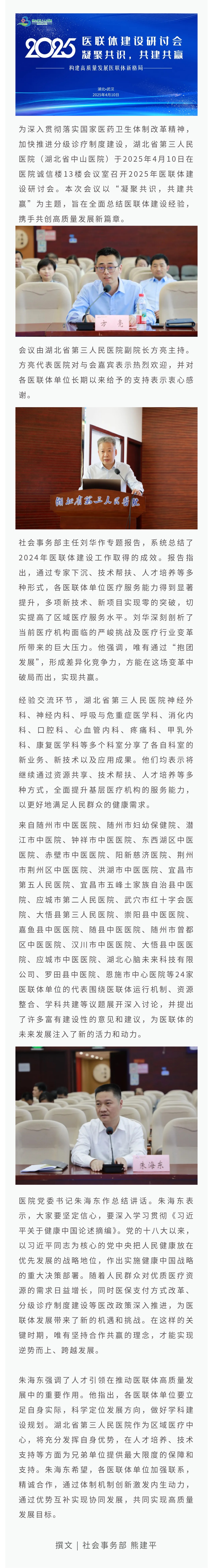 湖北省第三人民医院2025年医联体建设研讨会圆满召开 发布时间:2025-06-03 来源:社会事务部 上一篇:湖北省第三人民医院开展“青春心向党·医路勇担当”五四青年节主题活动 下一篇:湖北省第三人民医院:“专精特新”擘画高质量发展新图景