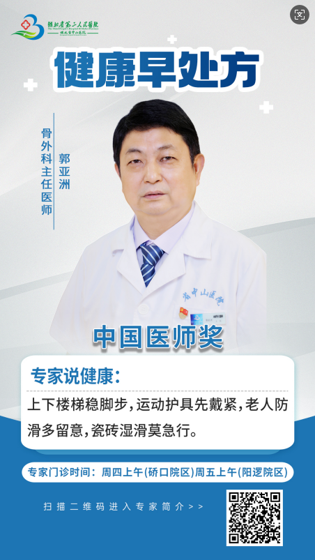 【健康早处方】郭亚洲:上下楼梯稳脚步,运动护具先戴紧,老人防滑多留意,瓷砖湿滑莫急行。 发布时间:2025-06-17 来源:宣传部 上一篇:【健康早处方】高宝安:守护肺部健康,远离烟草粉尘,流感季节戴口罩,出现发热合并呼吸困难,请及时就医 下一篇:【健康早处方】鼻子痒,喷嚏连,早查过敏早舒坦。