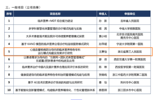 2025年6月26日,国家卫健委医院管理研究所公布《临床营养工作高质量发展研究项目》立项结果,湖北省第三人民医院(湖北省中山医院)临床营养科申报的《心脑血管疾病防治导向的临床营养特色专科运行模式构建及效果评价研究》》项目,从众多竞争者中突出重围,成功获得立项。