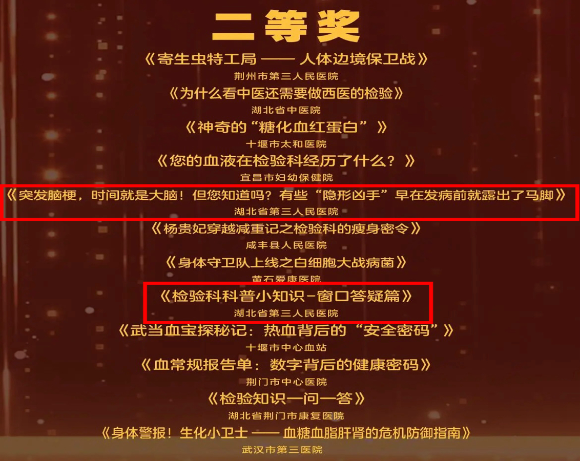 湖北省第三人民医院(湖北省中山医院)检验科在近日举办的2025 年度湖北省临床检验专业健康科普大赛中喜获佳绩,两部作品分别为:《突发脑梗,时间就是大脑,但您知道吗?有些“隐形杀手”早在发病前就露出了蛛丝马迹?》和《检验科科普小知识——窗口答疑篇》。